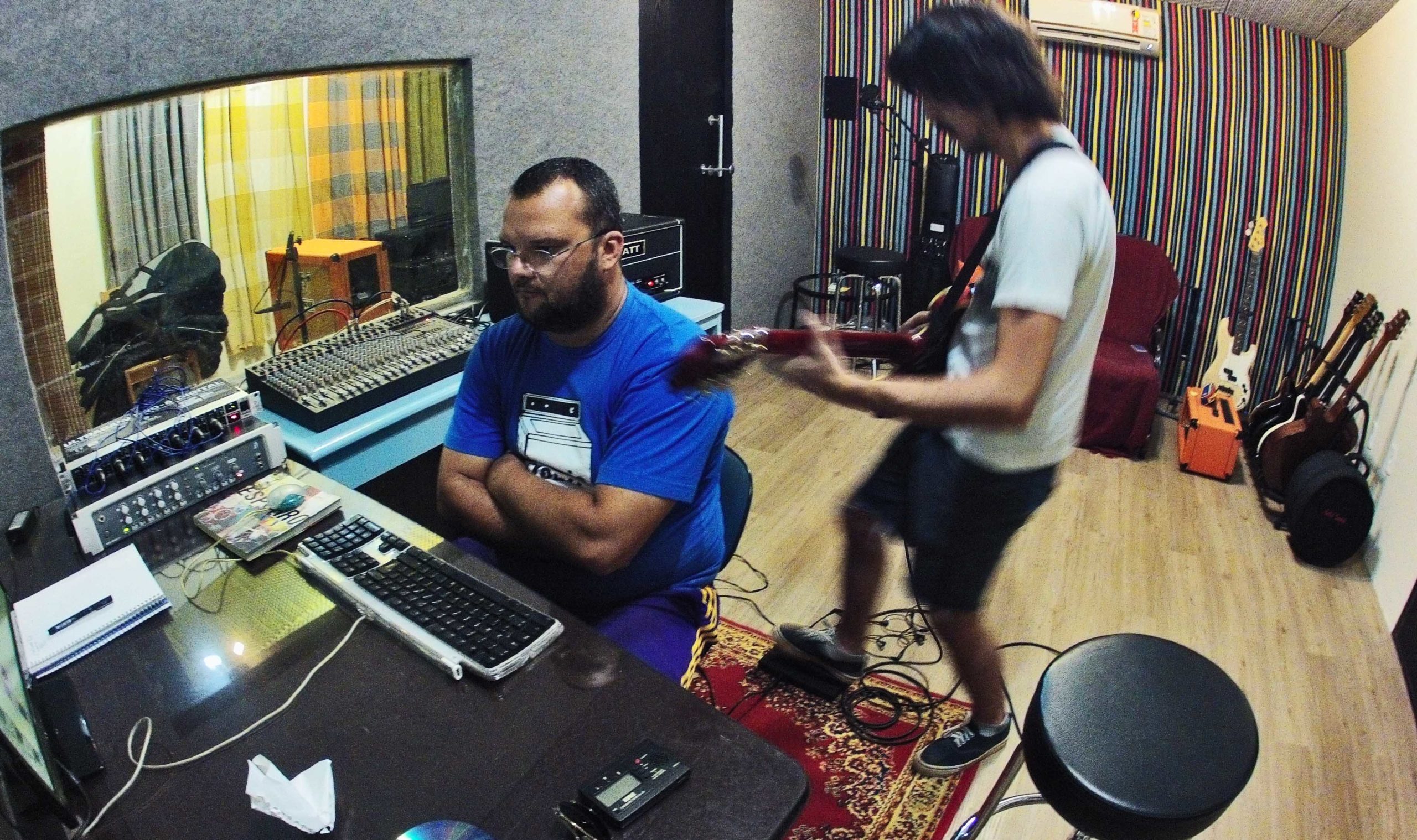 A sessão começou as 06h da manhã e foi até as 11h para finalizar os últimos detalhes das 09 músicas que já estão registradas do disco novo do Camarones Orquestra Guitarrística num total de 11. Na próxima quarta tem a última sessão de gravação do disco que vai se chamar “O Curioso Caso da Música Invisível”. Ontem a banda também recebeu no estúdio a visita do Portal No Ar que ouviu o álbum e entrevistou o grupo para uma matéria que deve sair nos próximos dias.