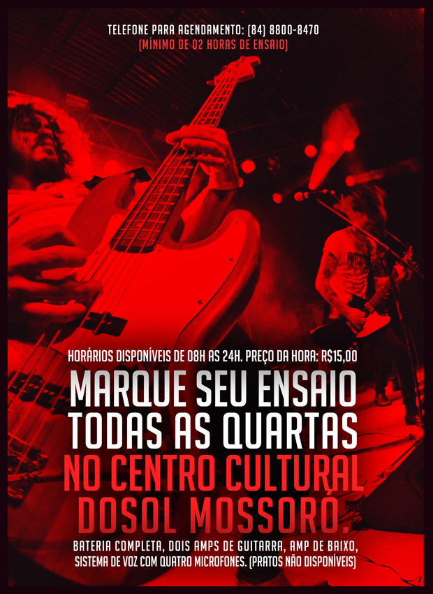 Quarta feira vai ser dia de você preparar sua banda ara a ação no Dosol Mossoró. Estamos disponibilizando nosso estúdio de ensaio para locação apenas nas quartas. Abriremos das 08h da manhã a meia-noite com agendamentos mínimos de duas horas por ensaio.