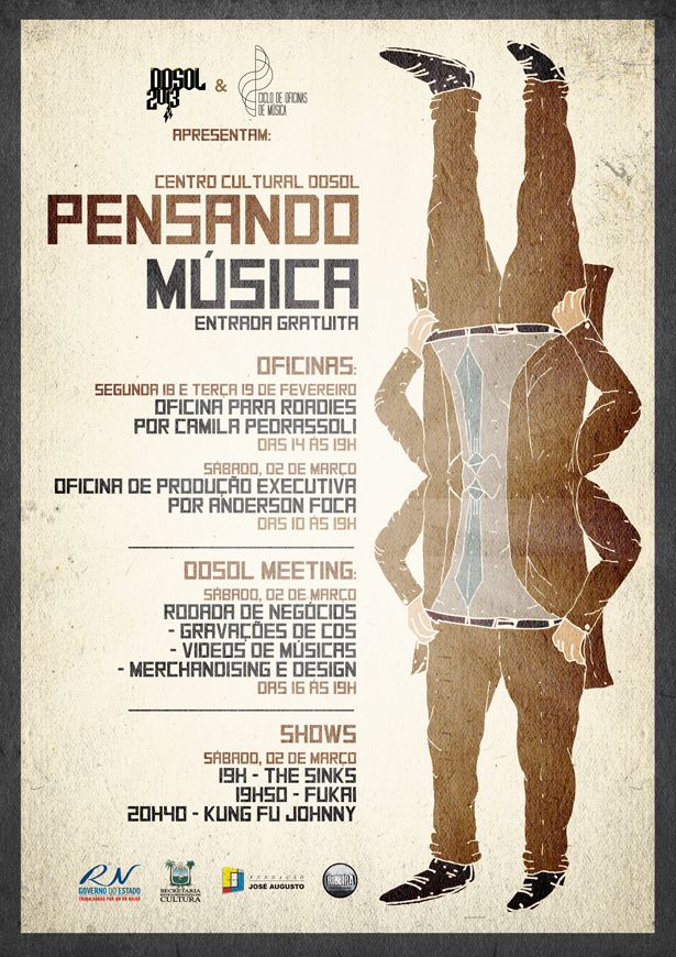 O ano do Dosol já começou faz tempo. As produções estão a todo o vapor na área da música, vídeos e design com grande fluxo de atividades. Logo após o carnaval, de 18 de fevereiro a 02 de março, o Dosol promove o “Pensando Música”, uma reunião de várias atividades de formação, negócios e apreciação ligados à música. Toda a programação acontece no Centro Cultural Dosol, Ribeira.