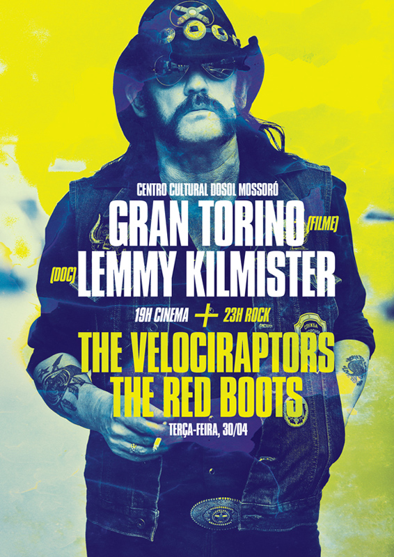 Desse bate papo, DAREMOS DUAS, duas oportunidades, a de você sacar o filmaço Gran Torino e o documentário da lenda viva do rock Lemmy Kilmister(Motorhead) comendo uma pipoquinha. Ae depois, vamos sacar os shows das bandas The Velociraptors que acaba de mudar de formação e tá com trampo novo na praça, e The Red Boots voltando da tour no estilo”fire rock” de ser, pra tomarmos uma boa cerva gelada e relaxar legal no feriado!!! A entrada é FREE nessa véspera de feriado pra terminar de escrever esse texto rápido e convidativo, bora nessa?
