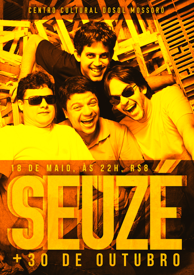 O quarteto SeuZé se apresenta no palco do Centro Cultural Dosol Mossoró neste sábado, 18 de maio. A banda, que tem por volta de uma década de idade, coleciona elogios e títulos vitoriosos do rock local. É um dos shows mais aclamados de Natal e uma das poucas bandas de sua geração que se mantém ativas até hoje. A banda mistura rock, pop, cordel e baião e lançou recentemente um single chamado “desapego” que pode ser baixado direto do site oficial: www.seuze.net.